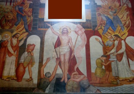 Debajo de La Piedad, un franciscano carga a un indio delante de una hoguera: ambas sucesos significan la redención, ya que Cristo al morir da la vida eterna y el fraile evangelizador salva de las llamas eternas al natural a través de la cristianización, por lo que de todo el conjunto emanan unas radiaciones transparentes denotando la expansión del cristianismo. Del lado derecho en un primer plano un franciscano da la comunión a un indígena hincado, que por su vestimenta con la capa era un personaje de mayor jerarquía; en el extremo unos cactus hieráticos entornan la evangelización de estas tierras. En un segundo plano está representado otro milagro de Jesús que es la Resurrección de Lázaro (Jn. 11. 1-46). De la cueva donde fue inhumado el hermano de Marta y María sale andando envuelto en vendas y Cristo con túnica blanca y manto rojo levanta la mano para llevar a cabo su prodigio. Arriba de la cueva, un árbol hueco guarece a la pequeña Virgen del Roble, la advocación mariana local y que es una de las pocas representaciones existentes. Del lado izquierdo del mural en primer plano está el milagro de la Sanación de un ciego (Jn. 9, 1-34), en el que Jesús con la mismas vestiduras, unta el lodo en los ojos del invidente al cual Zárraga viste como un personaje del siglo XX; el bastón roto alude al milagro de la recuperación de la vista, pues ya no será necesario usarlo. Una barda de tabiques separa a la escena del segundo plano en donde un franciscano sostiene una cruz y consuela a un indígena quien se hinca recibiendo la confortación espiritual. Al fondo unas edificaciones con almenas infieren el conjunto conventual franciscano de San Andrés que existió en la ciudad. Un maguey pinta el paisaje mexicano y en el fondo del mural la cordillera de la Sierra Madre ambienta todos los acontecimientos narrados en la localidad. Remata el mural igual que el anterior con ángeles de gran tamaño, ahora sustentando una cartela con el anagrama de Cristo y un par de indígenas sostienen el escudo de Monterrey. La firma en el ángulo inferior derecho: “ANGEL ZÁRRAGA 1945”. Esto nos indica que fue terminado antes que el de enfrente que fue el último.